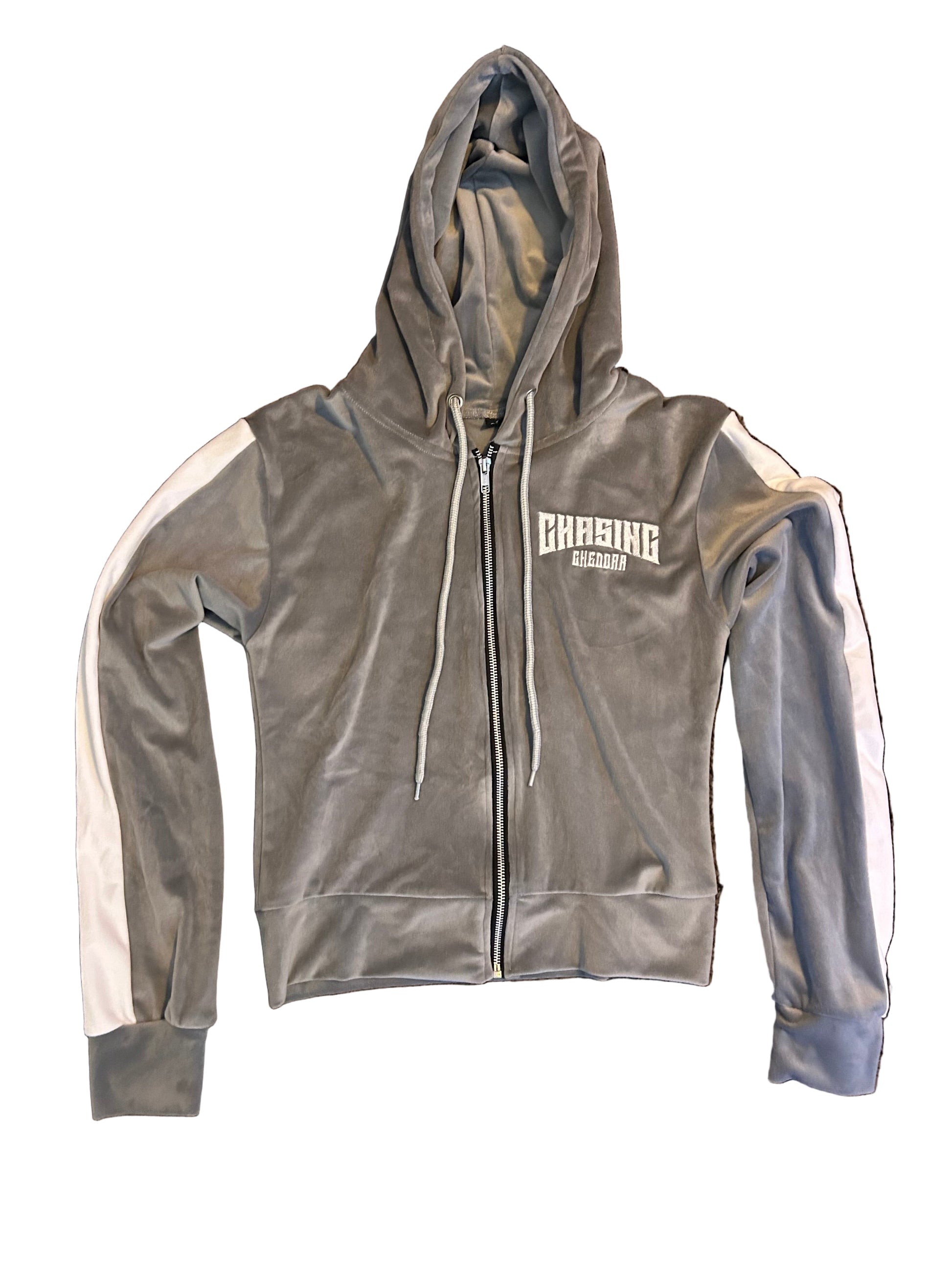 Soft, stretchy velvet jacket and shorts made for confidence and comfort. Features a cropped zip-up jacket with “Pretty Girls Love Cheddar” on the back and matching high-waisted shorts.